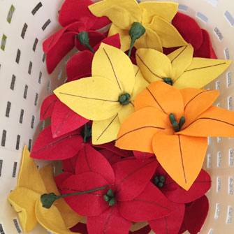 ④花びら5枚を取りそれぞれついている針金を一つに束ねてお花を作ります。