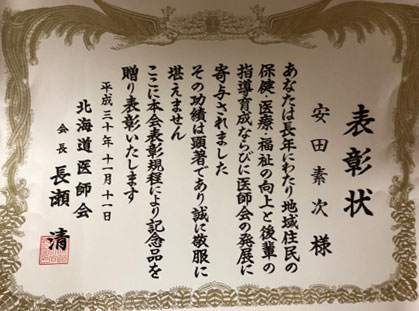 北海道医師会では地域医療推進に貢献顕著な会員を毎年表彰しており、地域医療の向上や医師の指導育成に貢献したとして、江別すずらん病院の安田院長が選ばれました。
